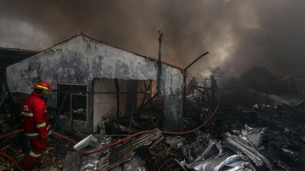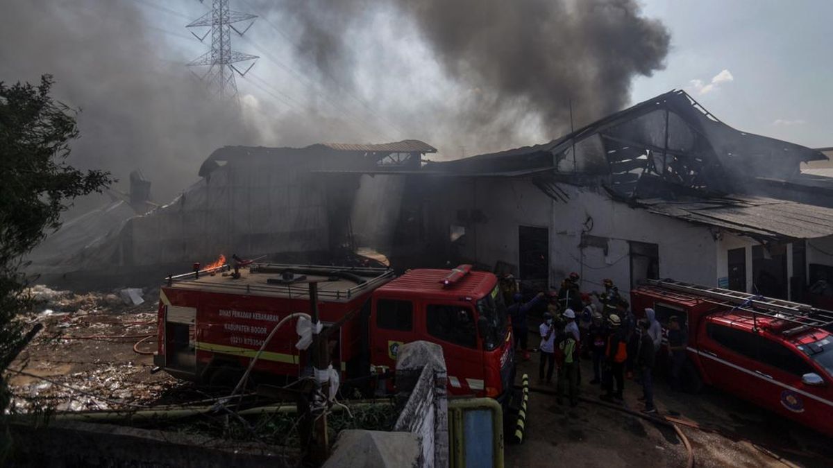 Petugas pemadam kebakaran berusaha memadamkan api yang membakar sebuah pabrik pembuatan alumunium foil di Gunung Putri, Kabupaten Bogor, Jawa Barat, Jumat (19/8/2022). (ANTARA FOTO/Yulius Satria Wijaya)
