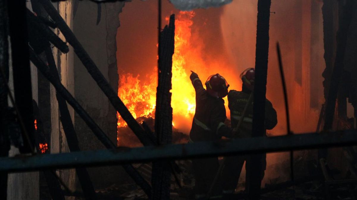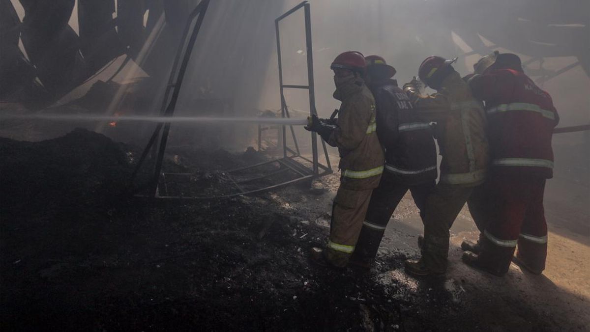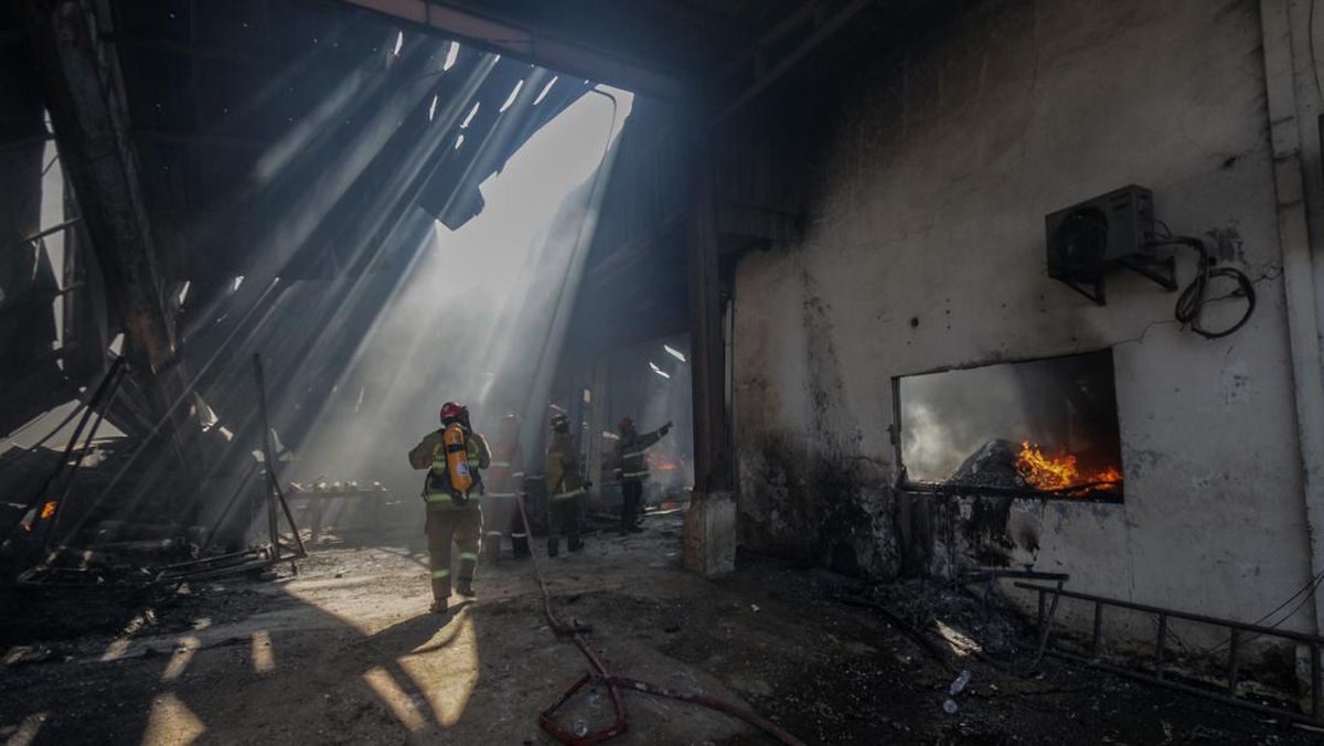 Petugas pemadam masuk ke dalam pabrik pembuatan alumunium foil yang terbakar di Gunung Putri, Kabupaten Bogor, Jawa Barat, Jumat (19/8/2022). (ANTARA FOTO/Yulius Satria Wijaya)