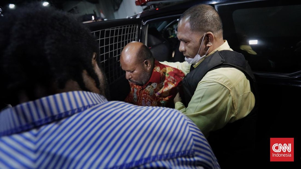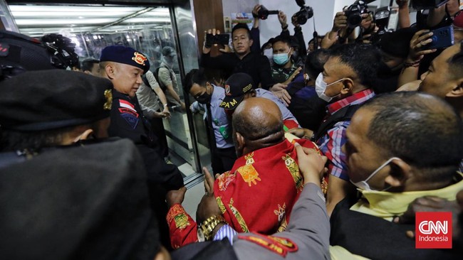 Gubernur Papua Lukas Enembe tiba di RSPAD Gatot Subroto, Selasa (10/1), setelah ditangkap KPK di Papua. Penangkapan Lukas memicu kericuhan pendukungnya.