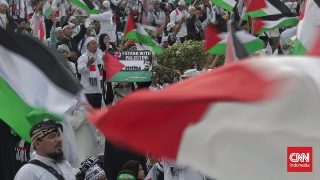 Ribuan massa Munajat Kubro 212 berkumpul di Monas, Jakarta, Sabtu (2/12) pagi. Mereka menggelar aksi solidaritas mendoakan Palestina yang terus digempur Israel.