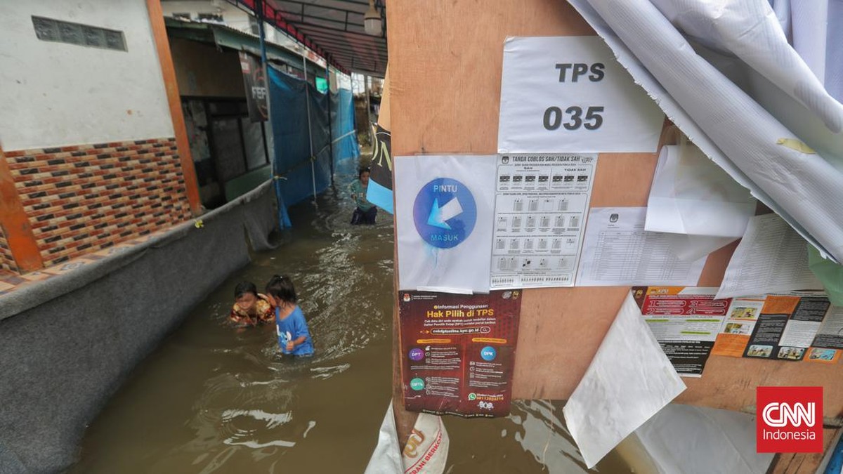 Hujan deras yang melanda wilayah DKI Jakarta di hari pencoblosan Pemilu 2024 mengakibatkan banjir di sejumlah tempat pemungutan suara (TPS).