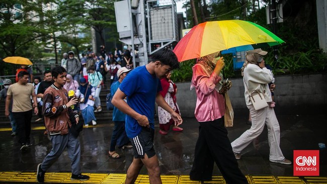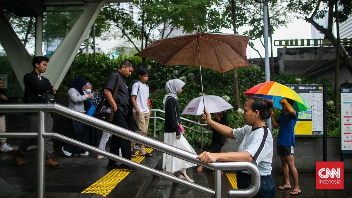 Jakarta, CNN Indonesia -- Sejumlah warga menyewakan payung di Kawasan Terowongan Kendal, Stasiun Sudirman, Jakarta, Kamis (4/7/2024).