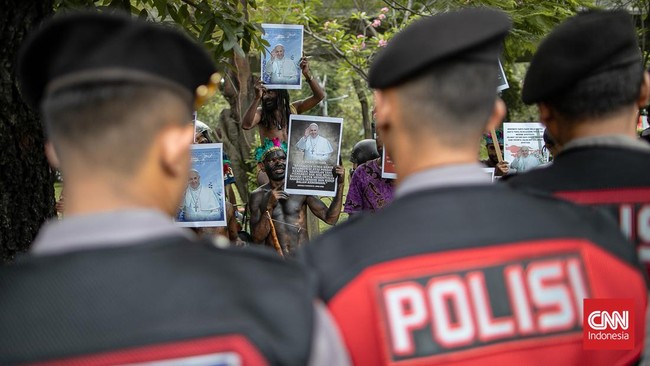 Pemuda Katolik Papua membawa poster saat menyampaikan pendapat di seberang Kedutaan Besar Vatikan, Gambir, Jakarta Pusat, Rabu (4/9/2024).