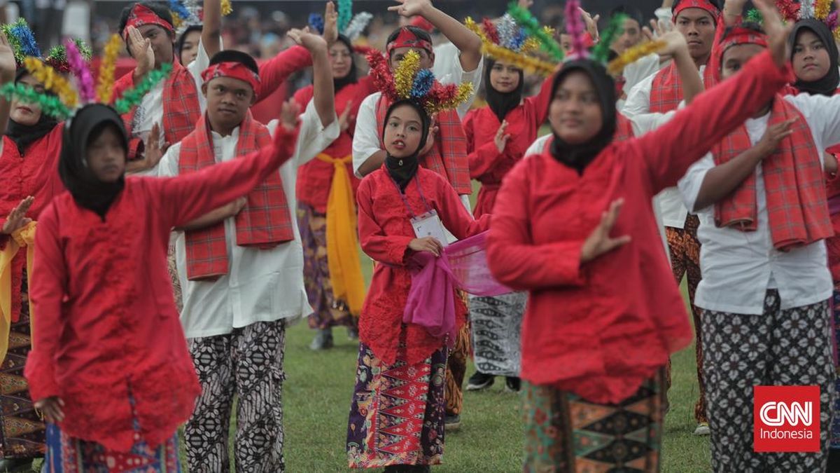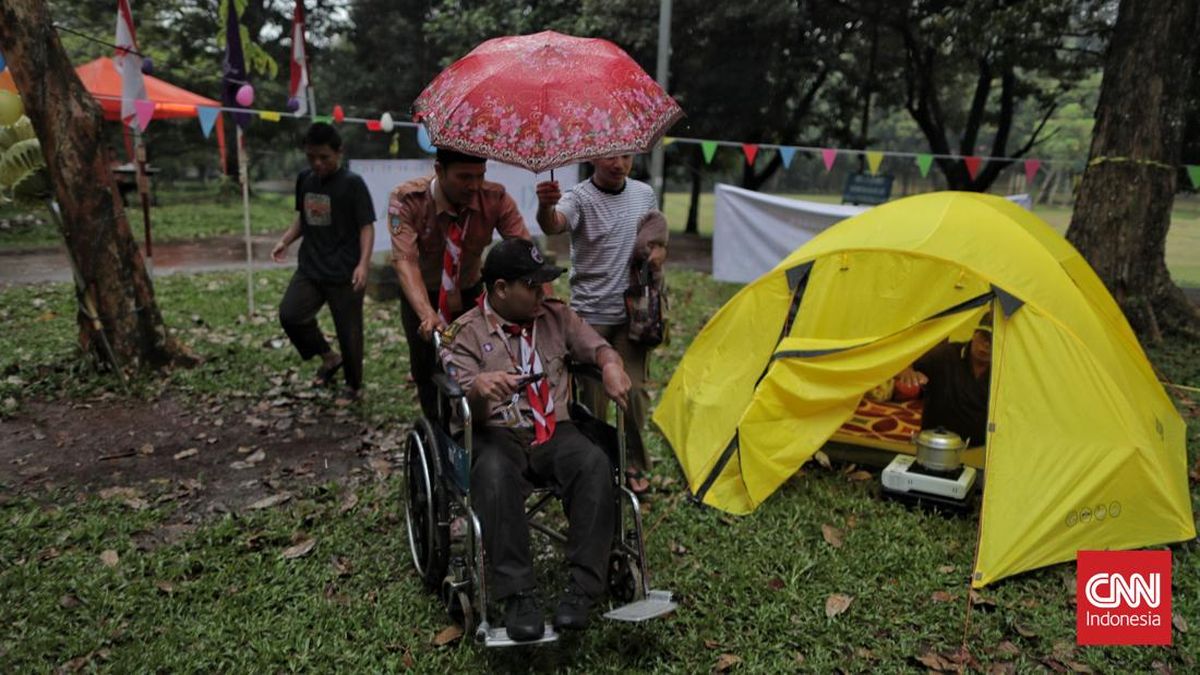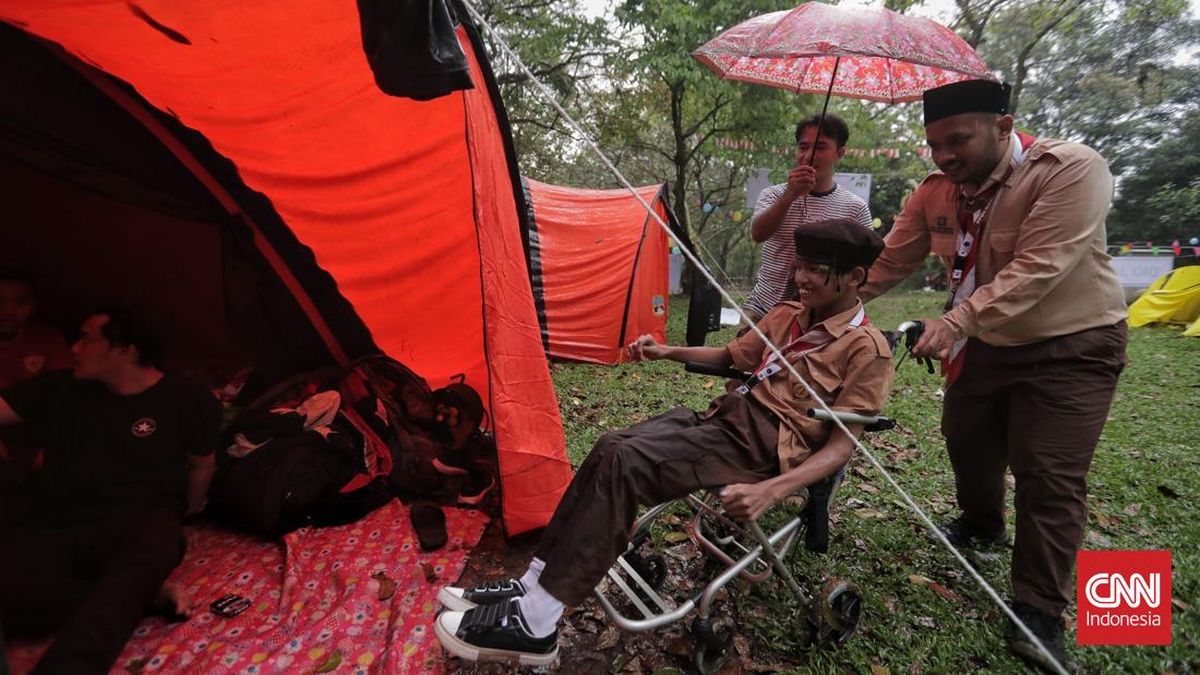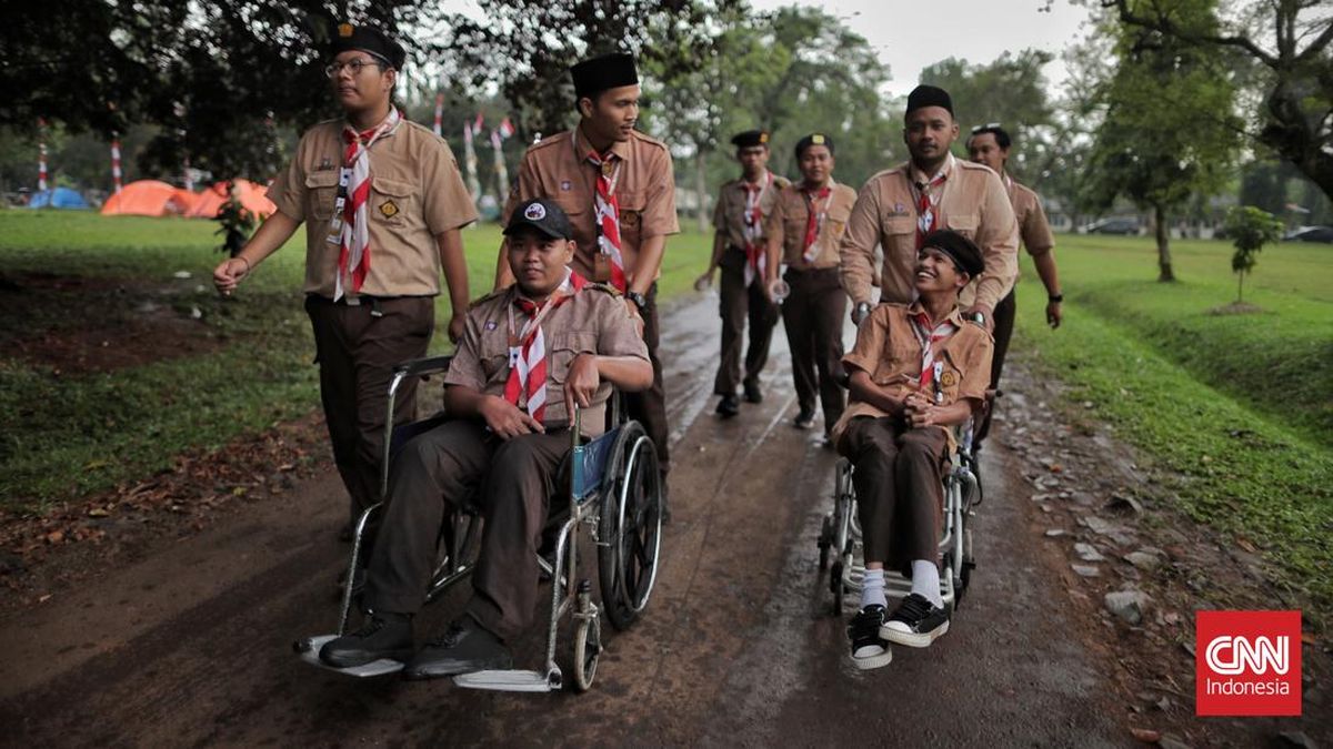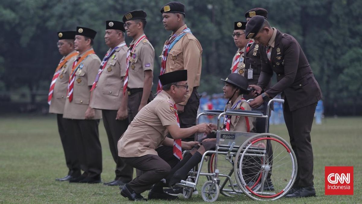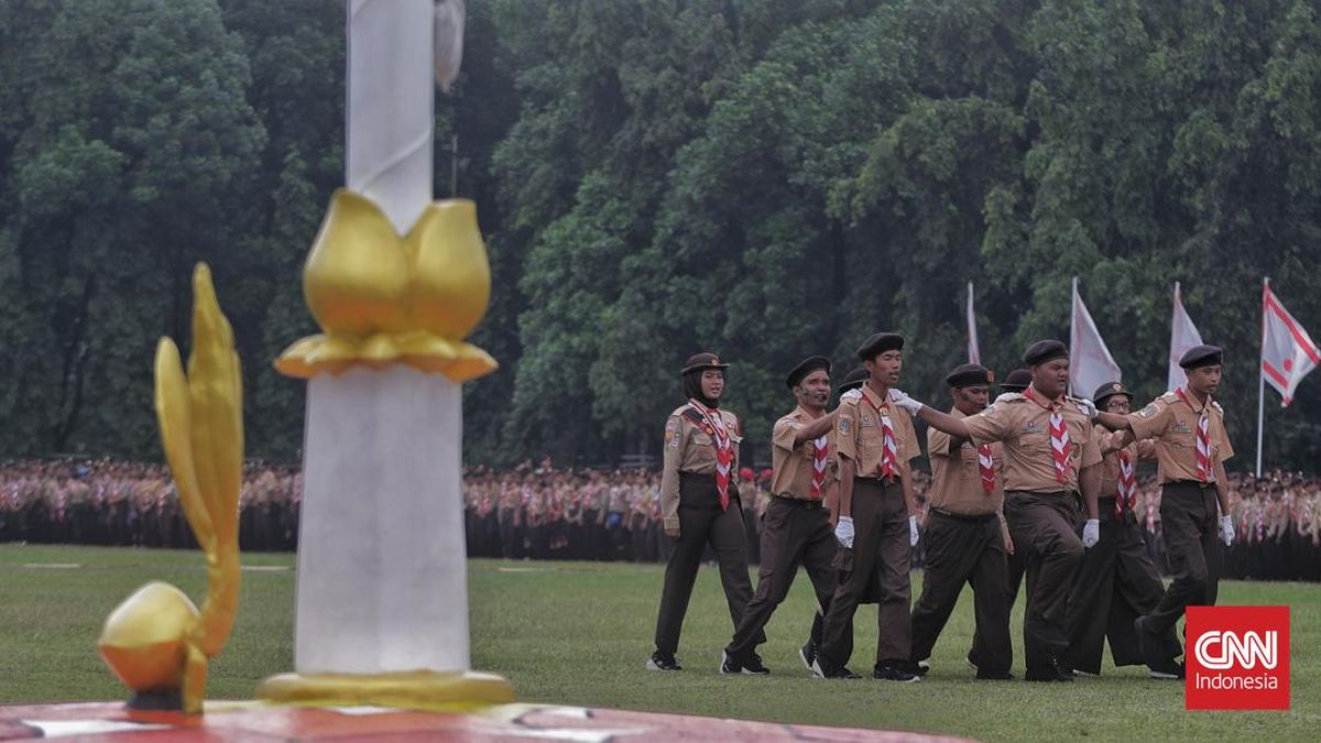 Upacara Peringatan Hari Pramuka ke-64 Tahun 2025 dan Pembukaan Perkemahan Pramuka Berkebutuhan Khusus (PPBK) Tingkat Nasional Tahun 2025 digelar di Lapangan Utama Bumi Perkemahan, Cibubur, Jakarta, Kamis, 14 Agustus 2025. (CNN Indonesia/ Adhi Wicaksono)