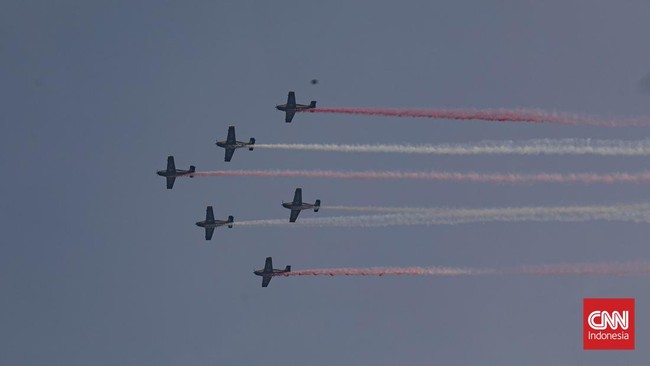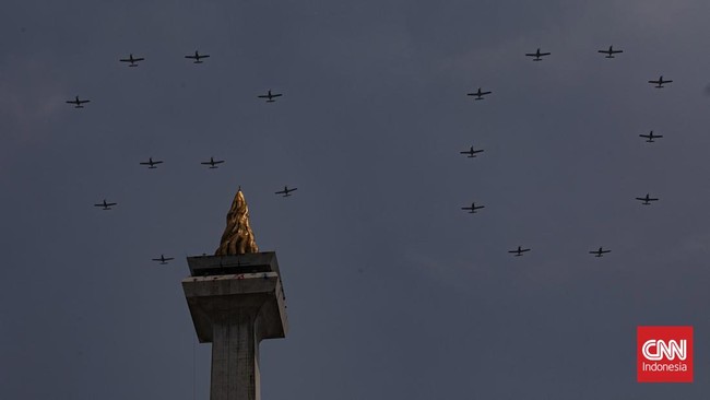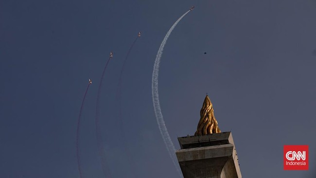 -- Sejumlah pesawat dari TNI AU beratraksi saat upacara HUT ke-80 TNI di kawasan Silang Monas, Jakarta.