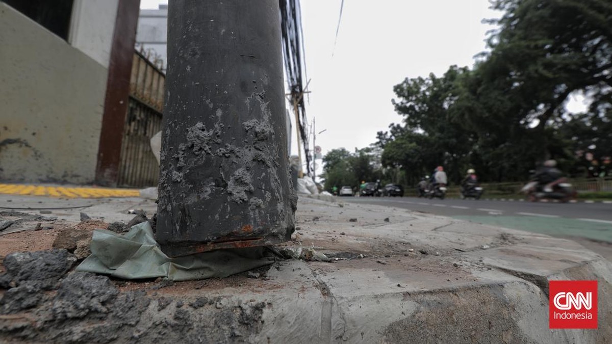 Sejumlah tiang listrik di Jalan Abdullah Syafei, kawasan Tebet, Jakarta Selatan, ditanam dengan konstruksi seadanya, membahayakan pengguna jalan.