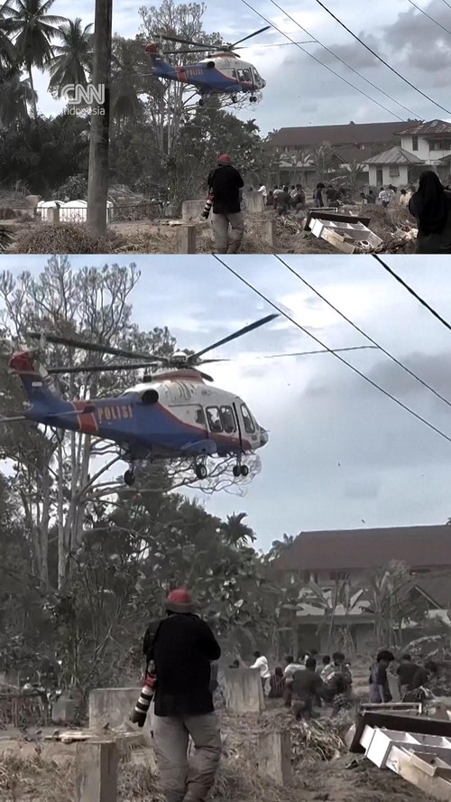 Orang dewasa hingga anak-anak tampak berlarian ketika helikopter pembawa bantuan kemanusiaan itu tiba.