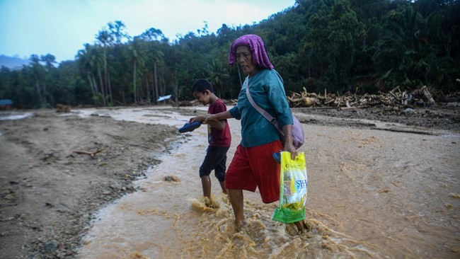Warga melintasi banjir yang menggenangi permukiman penduduk di Kelurahan Tukka, Kecamatan Tukka, Tapanuli Tengah, Sumatra Utara.