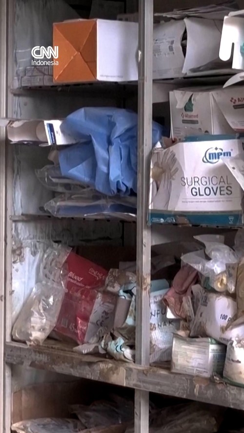 Banyak peralatan medis tertutup lumpur, dengan jarum suntik berserakan di lantai dan obat-obatan hanyut.