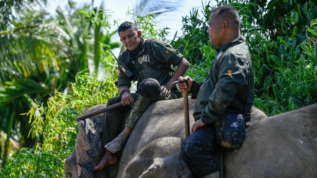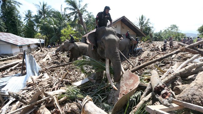 FOTO: Gajah-gajah Dikerahkan Bersihkan Gelondongan Kayu Banjir Aceh