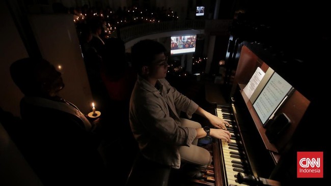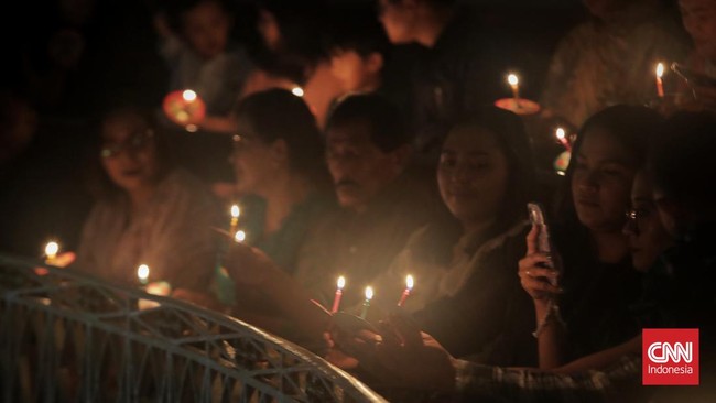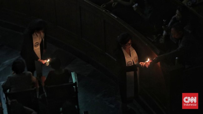 Jakarta, CNN Indonesia -- Jemaat mengikuti ibadah malam natal di GPIB Immanuel, Jakarta, Rabu (24/12) dengan memanjatkan doa, menyalakan lilin, dan menyanyikan pujian bagi Yesus Kristus.