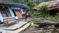Warga melihat rumahnya yang hancur karena peristiwa tanah gerak di Kabupaten Tegal, Jawa Tengah, 9 Februari 2026. (AFP/DEVI RAHMAN)