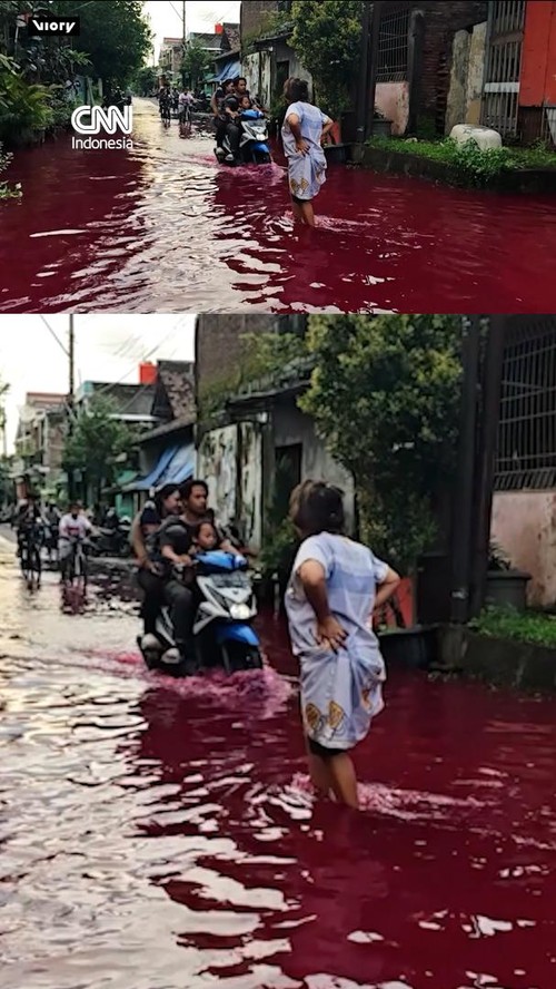Rekaman video menunjukkan warga berjalan menyeberangi air berwarna merah tua.