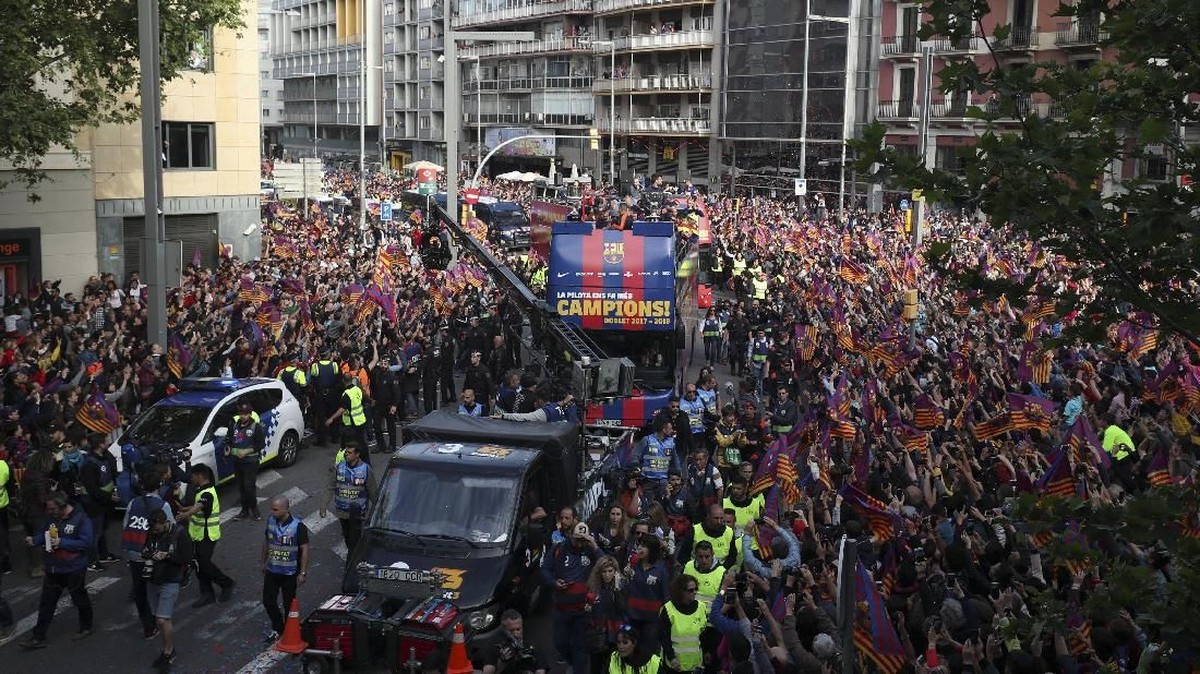 Jakarta, CNN Indonesia -- Para pemain Barcelona melakukan pawai keliling kota menggunakan bus atap terbuka setelah sukses merebut gelar Liga Spanyol, Senin (30/4).