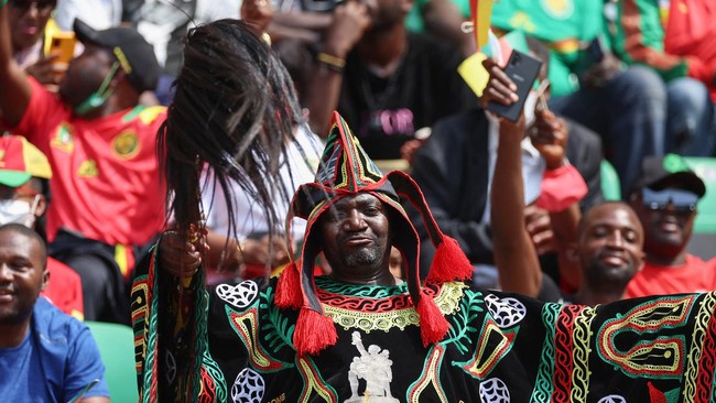 CNN Indonesia -- Suporter Kamerun tampil meriah dalam memberi dukungan kepada kesebelasan kesayangan mereka di Piala Afrika 2021.