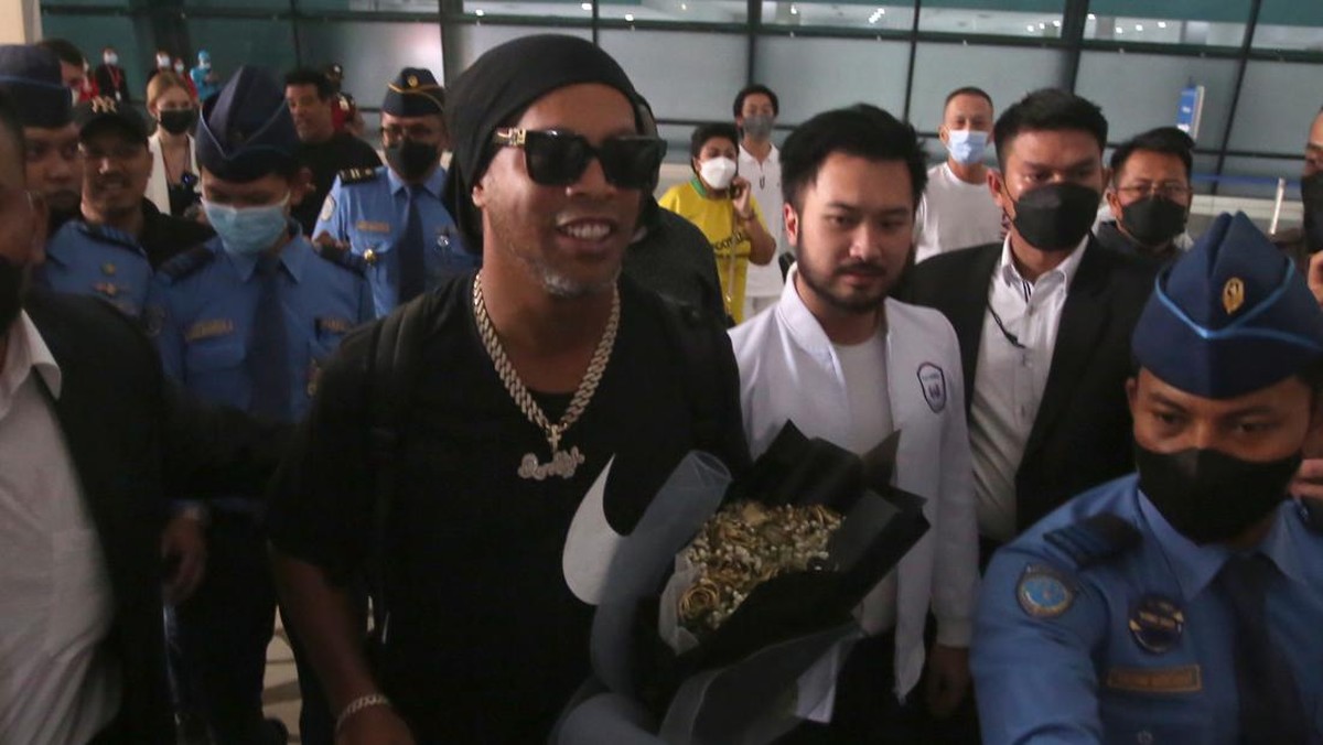 Ronaldinho tiba di Indonesia pada Jumat (24/6) sore dan langsung disambut dua pemilik Rans Nusantara FC, Raffi Ahmad dan Rudy Salim.