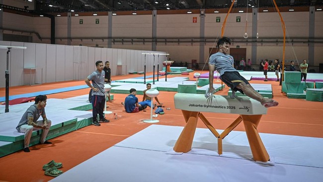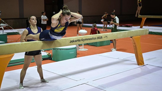 Para atlet gimnastik mulai berlatih di Jakarta Convention Center (JCC), Jakarta, Rabu (15/10), jelang Kejuaraan Dunia Gimnastik 2025.