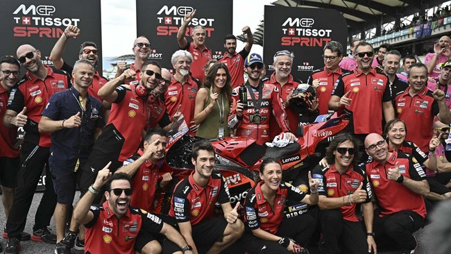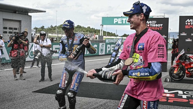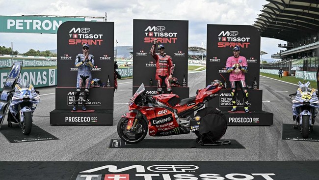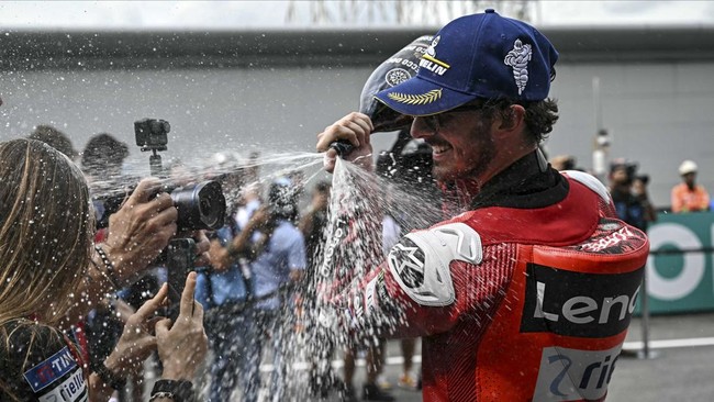 Jakarta, CNN Indonesia -- Pembalap Ducati Francesco Bagnaia tersenyum cerah usai memenangkan sesi sprint race MotoGP Malaysia 2025 di Sirkuit Sepang, Sabtu (25/10).