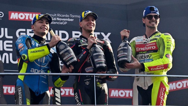 Musim balap MotoGP 2025 berakhir di Valencia. Marco Bezzecchi bisa tersenyum girang karena menjadi juara full race di Sirkuit Ricardo Tormo, Minggu (16/11).