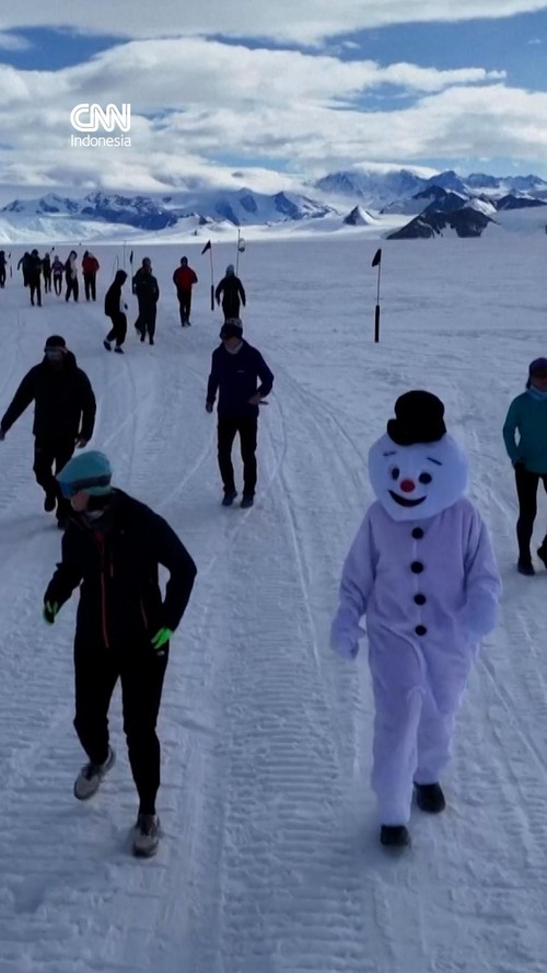 Sekelompok pelari maraton di Antartika melakukan kompetisi lari satu mil atau sekitar 1,6 kilometer secara terbalik, Senin (15/12).