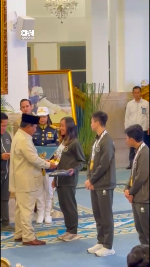 Presiden RI Prabowo Subianto memberikan bonus kepada atlet Indonesia peraih medali SEA Games 2025 di Istana Negara, Jakarta, Kamis (8/1).
