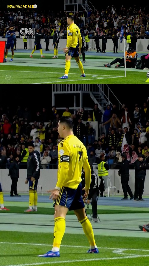Senyum Cristiano Ronaldo mengembang seiring dengan selebrasi 'siuu' dalam laga Dhamk vs Al Nassr pada lanjutan Saudi Pro League, Kamis (22/1) waktu Indonesia.