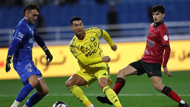 Cristiano Ronaldo cetak gol saat Al Nassr mengalahkan Al Kholood 3-0 pada lanjutan Liga Arab Saudi di King Abdullah Sport City, Sabtu (13/1) dini hari WIB.