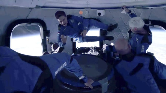 Bezos melakukan penerbangan ke batas luar angkasa 100 kilometer dari permukaan Bumi bersama tiga orang lain, Mark Bezos (adik), "Wally" Funk (82), dan remaja Belanda Oliver Daemen (18).