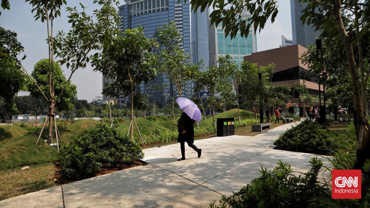 -- Warga yang beraktivitas di Jakarta ramai-ramai menggunakan pelindung kepala atau payung untuk mencegah teriknya paparan Matahari langsung saat musim kemarau.