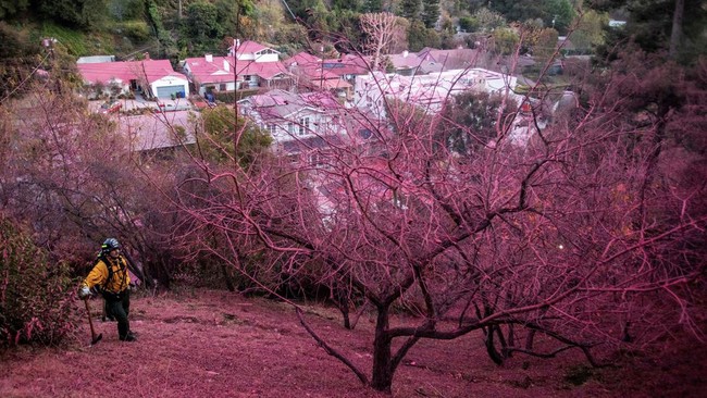 AS terus berupaya memadamkan kebakaran dahsyat di Los Angeles, salah satunya dengan menyiramkan cairan berwarna pink dari langit. Ini penampakannya.