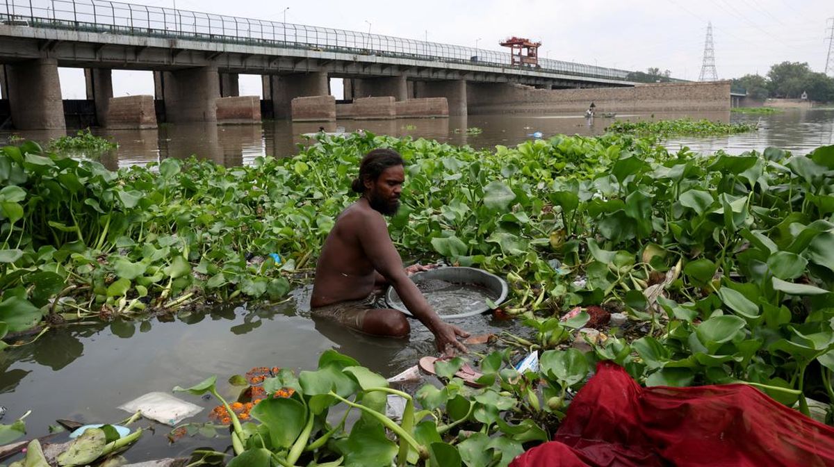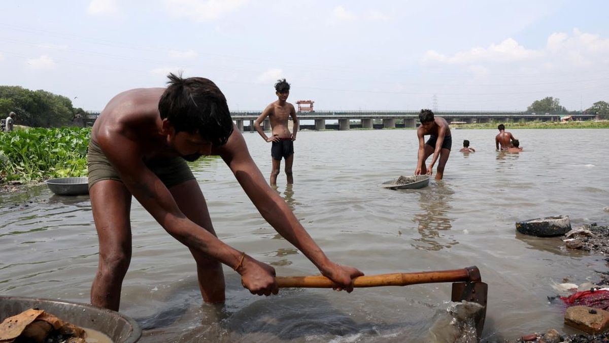 Warga mencari barang-barang berharga yang dilemparkan oleh umat Hindu sebagai persembahan keagamaan di perairan Sungai Yamuna di New Delhi, India. REUTERS/Bhawika Chhabra