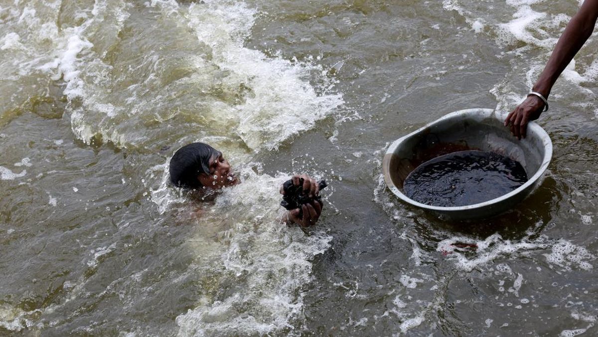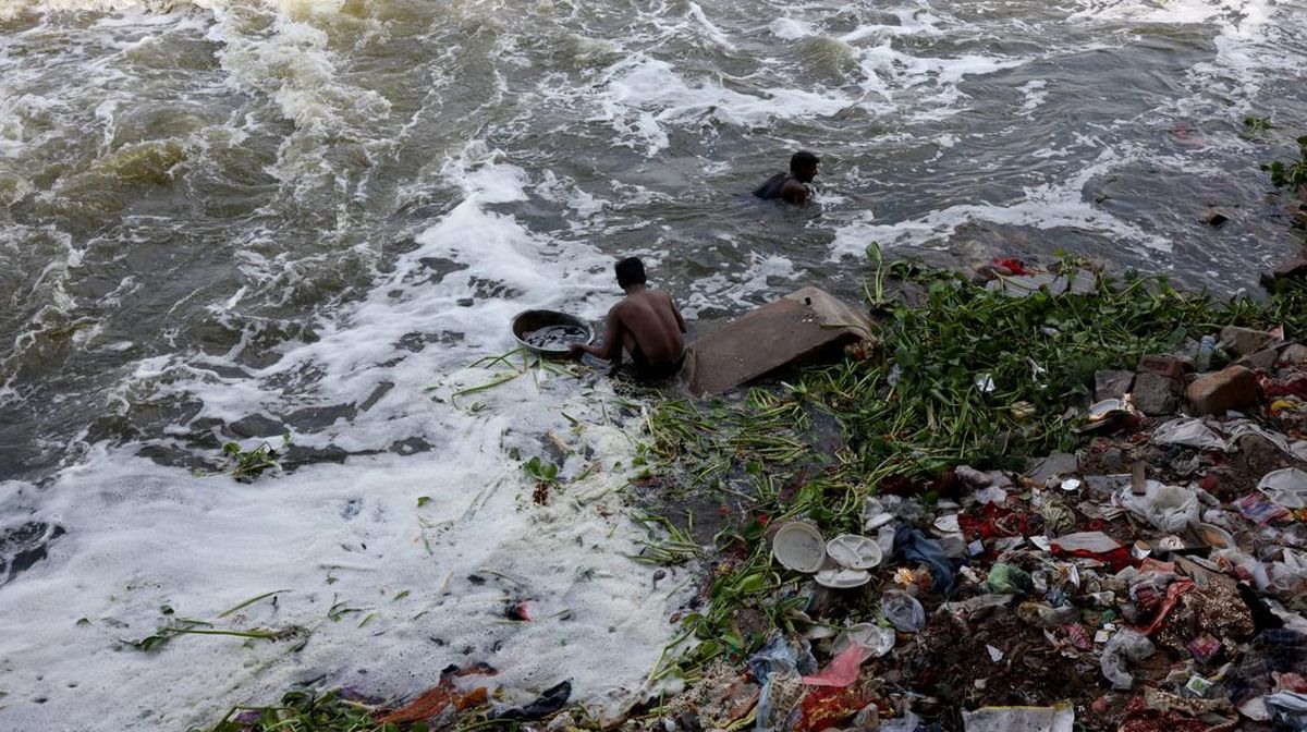 Umat Hindu menganggap sungai sebagai tempat suci dan para peziarah melemparkan persembahan, termasuk koin, kelapa, dan bunga, ke dalam air untuk "dewi sungai" yang menopang kehidupan dengan memberikan air untuk minum dan irigasi. REUTERS/Bhawika Chhabra
