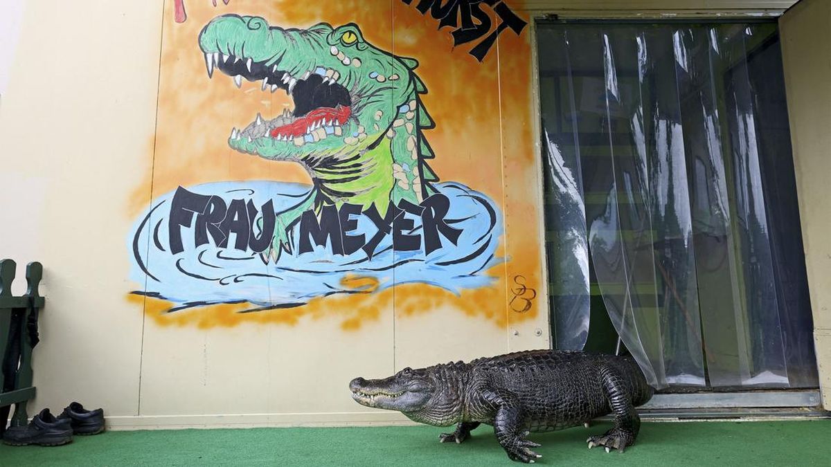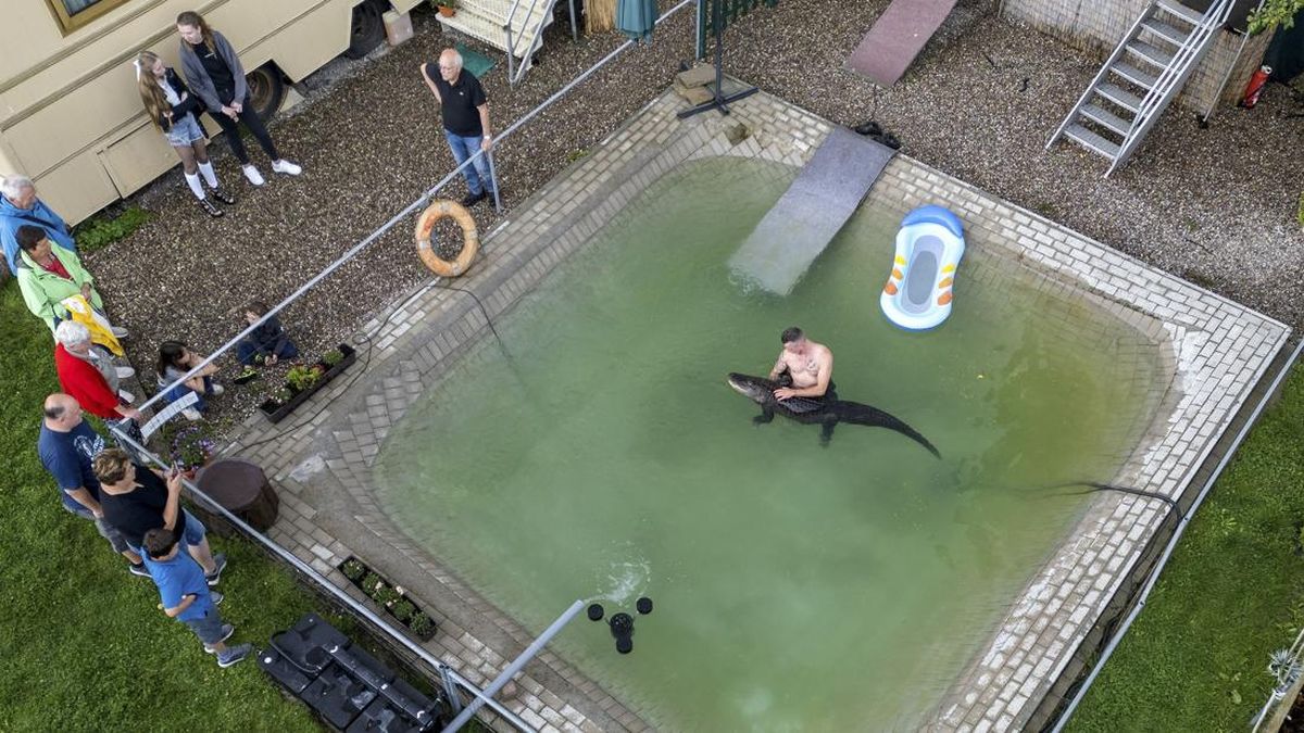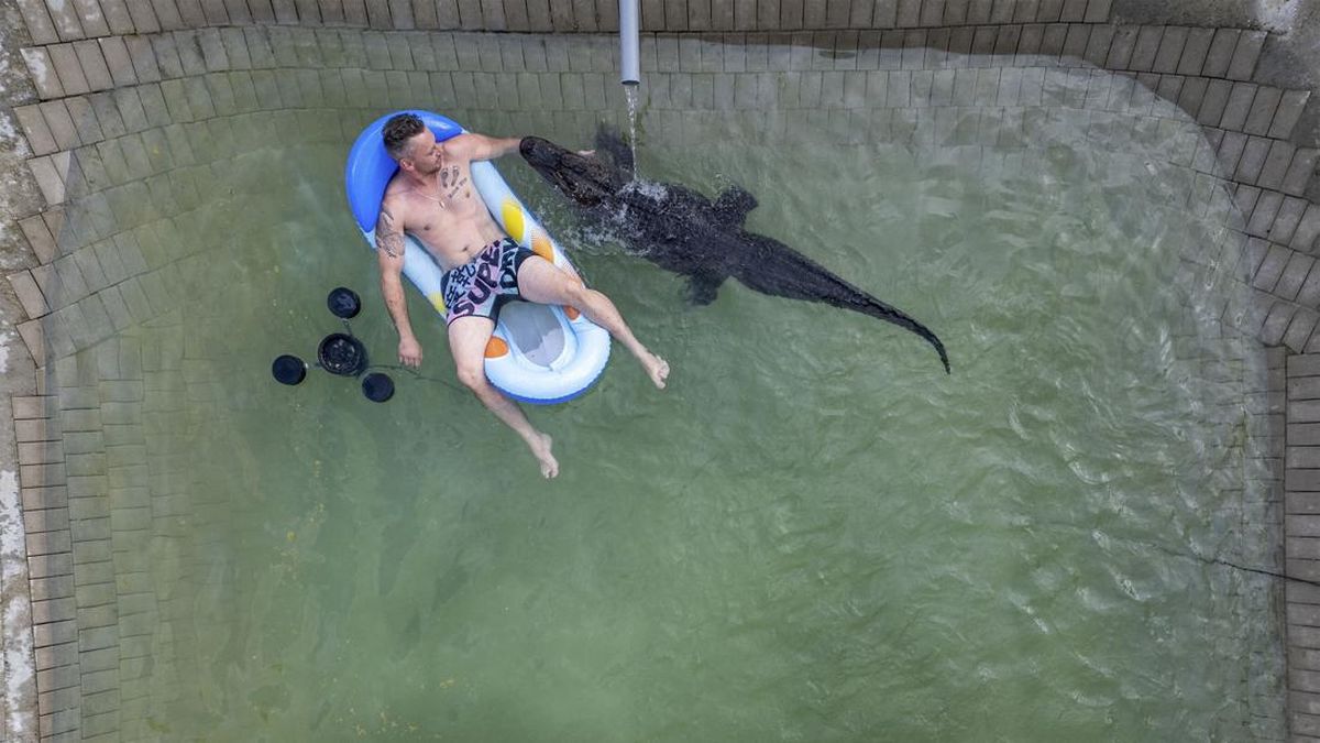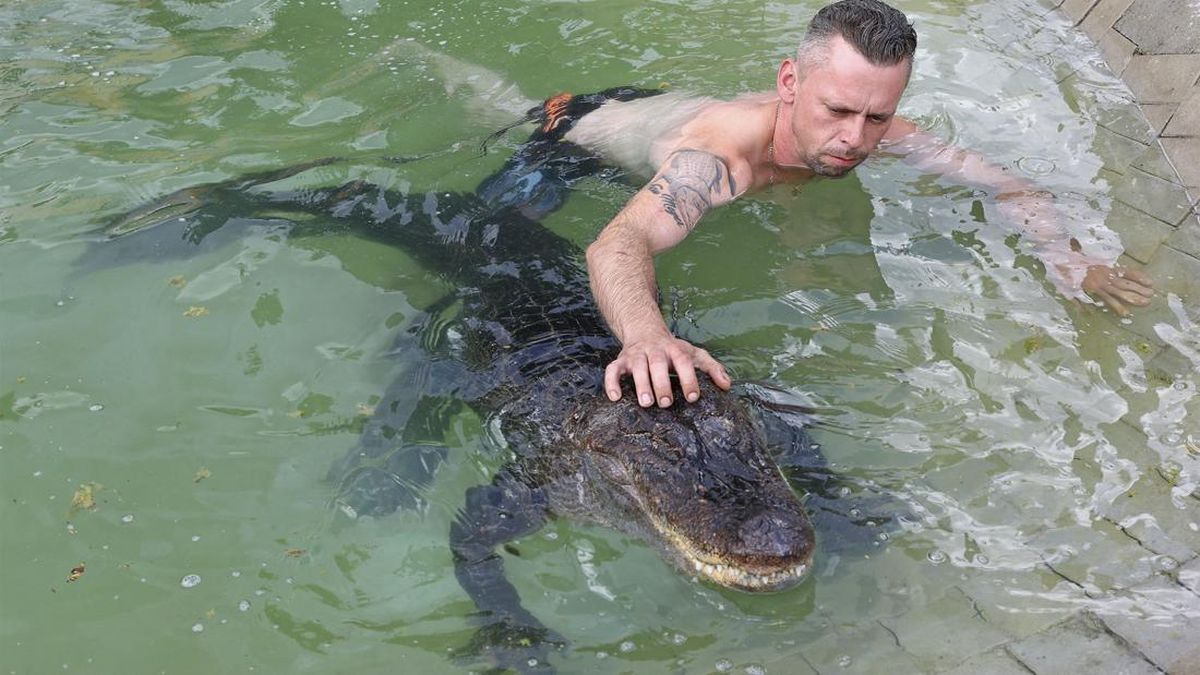 Mantan pemain sirkus Krystian Kaulis berenang bersama Ms. Meyer, seekor aligator, di kolam renang terbuka di Elmenhorst, Jerman, 1 Agustus 2025. (Foto: REUTERS/Lisi Niesner)