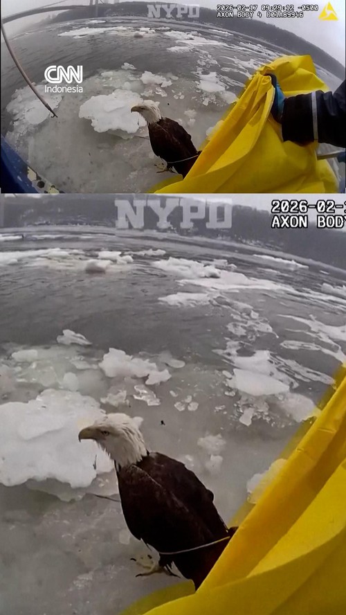 Petugas Kepolisian New York (NYPD) menyelamatkan seekor elang botak yang terluka dan terjebak di Sungai Hudson yang membeku, Selasa (17/2).